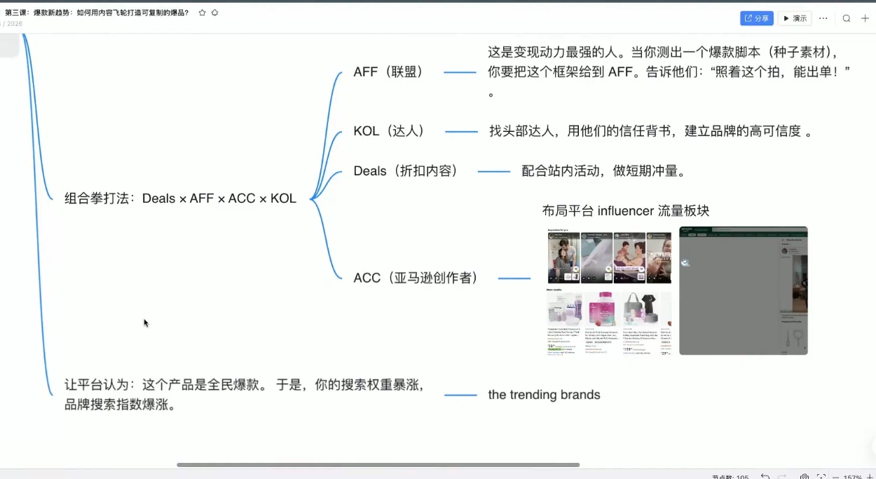 这是一套专为跨境电商卖家打造的2026年增长实战课。课程以“内容飞轮+精准投放”为核心,从COSMO用户意图洞察、Rufus工具实操到TikTok内容SOP,帮你重构爆款底层逻辑。它会拆解“人×货×场”黄金公式,用Review挖掘用户需求,搭建从品牌认知到转化的三层广告架构,还包含多身份POV破圈和团队管理方法,让你掌握可复制的爆款打造能力,在亚马逊与TikTok流量红利中精准突围。
